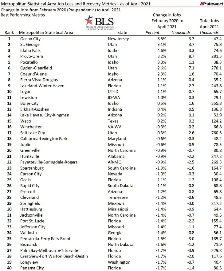 The answer to Mirror Mirror on the Wall, Which Metros are the Most Recovered of All is detailed in the following table listing the 40 MSAs with the best percentage change in jobs from February 2020 through April 2021. All metrics are based on the just-released April employment data from the U.S. Bureau of Labor Statistics (BLS) using seasonally adjusted data. Just 15 of the 380 metros with monthly data reported by the BLS posted a gain in total jobs comparing April 2021 to February 2020 – the month prior to the pandemic. Two states posted almost unbelievably strong job recoveries: Idaho and Utah. Amazingly, Utah, which has a total of five MSAs, all are included in the 40-best job performance MSAs in the country, with four of the five ranked 10th best or better. Though Salt Lake City still had a job deficit when compared to February 2020, it ranked 17th best overall and is only down 0.3 percent from the pre-pandemic level. Idaho’s five total MSAs all had more jobs in April than any time in history – each ranking in the top 12.