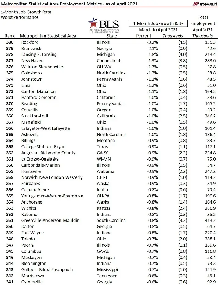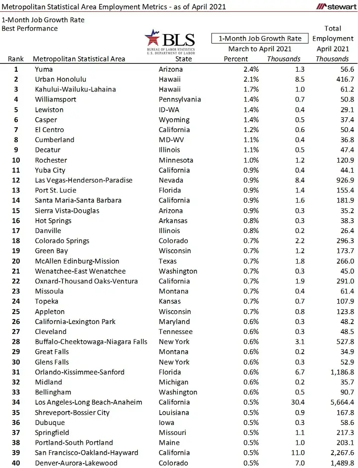 One-month job growth (and loss) percentages from March to April 2021 are shown in the next two tables for the best and worst 40 MSAs.