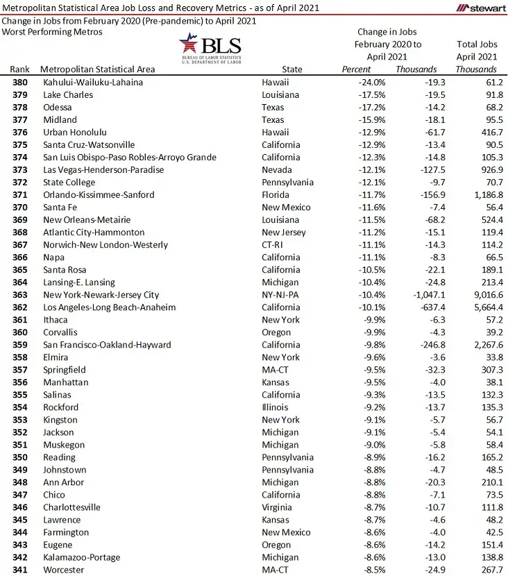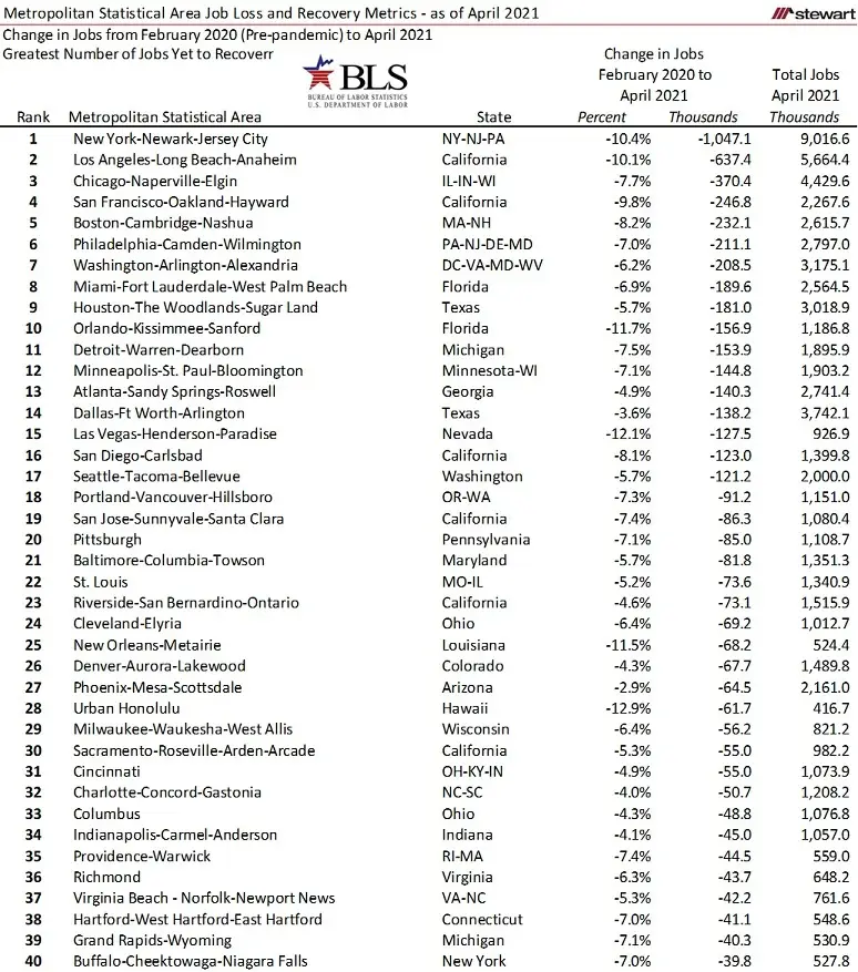 While the pandemic continues to evolve, each day looks more promising – including jobs. After all, jobs are everything to the economy as long as we are not living in fairy tales. Yet to be seen is if and which MSAs the pandemic has permanently altered long-term growth trajectories.